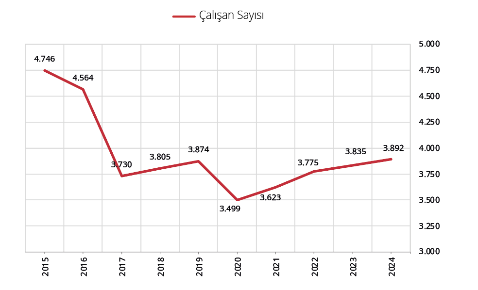 2024 yılı içerisinde 132 çalışan istihdam edilmiş olup 75 çalışan işten ayrılmıştır. Fiilî çalışan sayısı bir önceki yıla göre 57 kişi artarak yıl sonu itibarıyla 3.892 olarak gerçekleşmiştir. (Grafik 1.2.1).