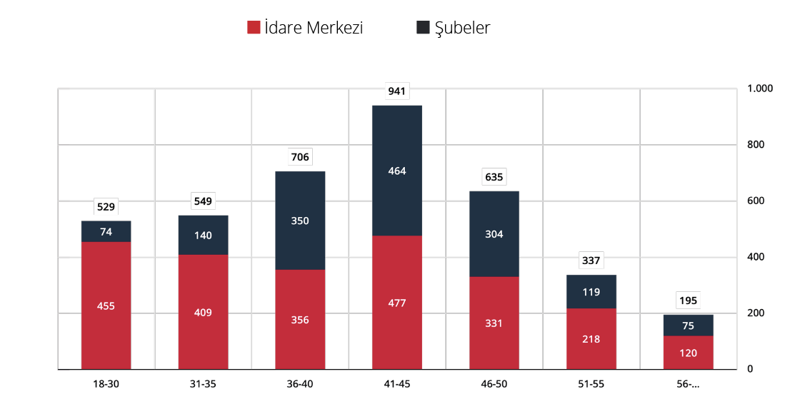 Çalışanların yüzde 60,79’u İdare Merkezinde, yüzde 39,21’i ise şubelerde görev yapmaktadır. Çalışanların yaş gruplarına göre dağılımına bakıldığında, yüzde 42,32 ile büyük çoğunluğu 36-45 yaş aralığında bulunmaktadır (Grafik 1.2.2). Öğrenim durumuna göre dağılım incelendiğinde ön lisans, lisans ve lisansüstü öğrenim yapmış çalışanların payının yüzde 89,54 olduğu görülmektedir (Grafik 1.2.3).
