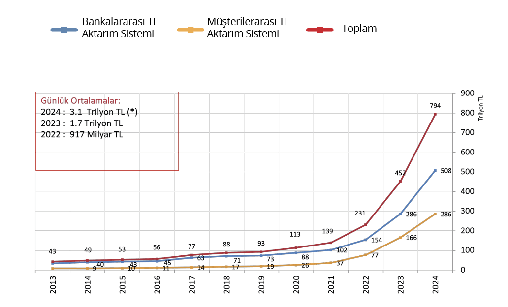 (*) 2 trilyon TL Bankalararası TL Aktarım Sisteminden ve 1.1 trilyon TL Müşterilerararası TL Aktarım Sisteminde gerçekleşen ödemedir.