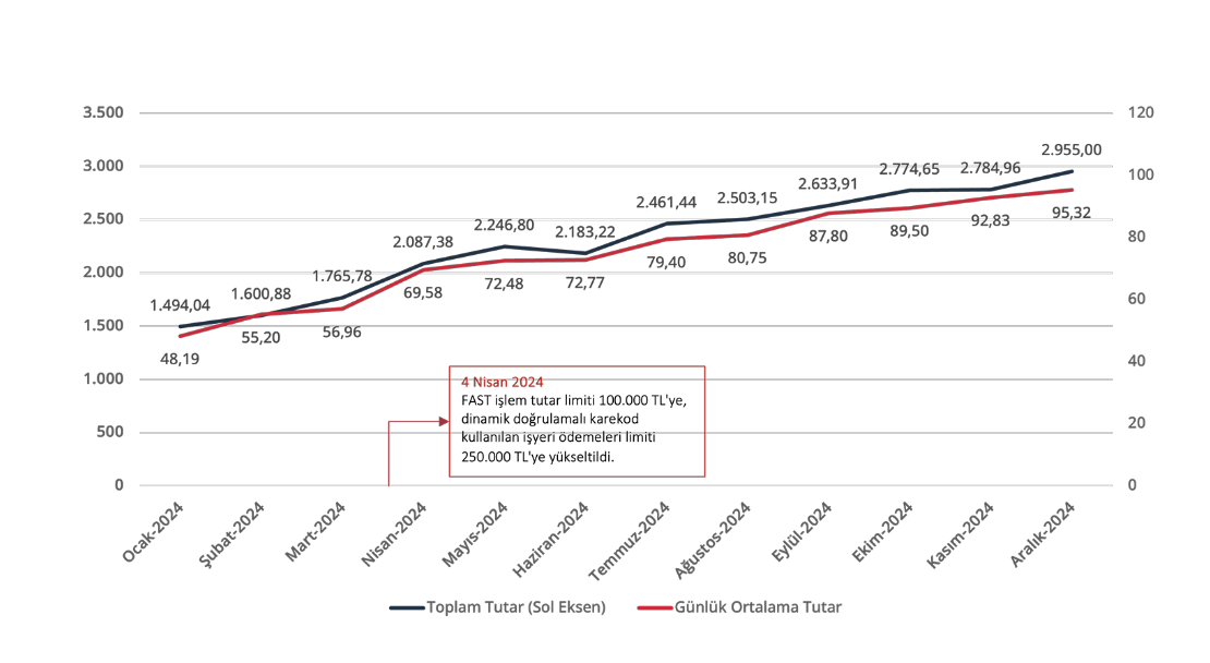 Kademeli olarak artırılan FAST işlem tutar limiti, 4 Nisan 2024 tarihinde 100 bin TL’ye, dinamik doğrulamalı karekod kullanılan iş yeri ödemeleri limiti ise 250 bin TL’ye yükseltilmiştir.
