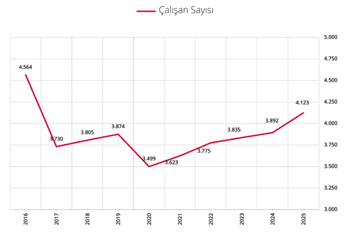 2025 yılı içerisinde 282 çalışan istihdam edilmiş olup 51 çalışan işten ayrılmıştır. Fiili çalışan sayısı bir önceki yıla göre 231 kişi artarak yıl sonu itibarıyla 4.123 olarak gerçekleşmiştir (Grafik 1.2.1).