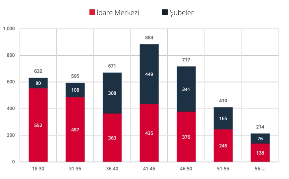 Çalışanların yüzde 62,96’sı İdare Merkezinde, yüzde 37,04’ü ise şubelerde görev yapmaktadır. Çalışanların yaş gruplarına göre dağılımına bakıldığında, yüzde 38,83 ile büyük çoğunluğu 41-50 yaş aralığında bulunmaktadır (Grafik 1.2.2). Öğrenim durumuna göre dağılım incelendiğinde ön lisans, lisans ve lisansüstü öğrenim yapmış çalışanların payının yüzde 90,64 olduğu görülmektedir (Grafik 1.2.3).