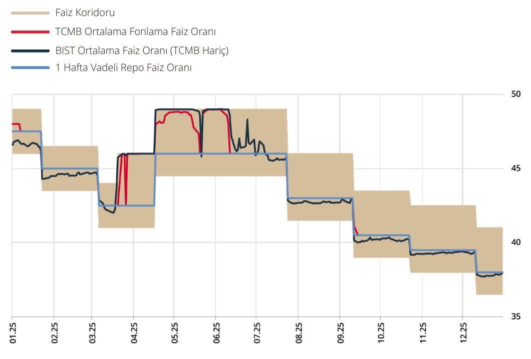 TCMB, 2025 yılı ocak ve mart aylarında politika faizini toplamda 500 baz puan indirerek yüzde 42,5 seviyesine getirmiştir. Mart ayı ortasında finansal piyasalardaki gelişmelerin enflasyon görünümü açısından oluşturabileceği riskleri sınırlamak için, 20 Mart 2025 tarihinde yapılan ara PPK toplantısında gecelik vadede borç verme faiz oranının yüzde 46’ya yükseltilmesine, politika faizi ve gecelik borçlanma faiz oranlarının ise sabit tutulmasına karar verilmiştir. Ayrıca bir hafta vadeli repo ihalelerine bir süre ara verilmiş ve fonlama gecelik borç verme faiz oranından yapılmıştır. Nisan ayında, TCMB, finansal piyasalardaki gelişmelerin enflasyonun ana eğilimi üzerindeki etkilerine dikkat çekerek, politika faizini yüzde 46’ya; gecelik vadede borç verme faiz oranını yüzde 49’a, gecelik vadede borçlanma faiz oranını ise yüzde 44,5’e yükseltmiş ve bir haftalık repo ihalelerine yeniden başlanacağını duyurmuştur. TCMB, politika faizini haziran ayında sabit tutmuş, takip eden toplantılarda ise aralık ayı itibarıyla toplam 800 baz puanlık indirimle yüzde 38’e düşürmüştür. TCMB, ekonomik birimlerin beklentilerindeki ayrışma ve olası oynaklıklara karşı, parasal aktarımın etkinliğini artırmak amacıyla, makroihtiyati politikaları uygulamaya 2025 yılında da devam etmiştir.