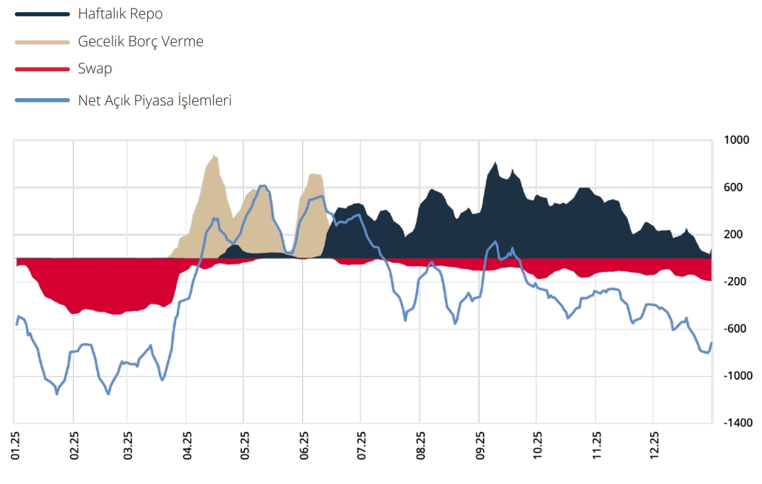 Mevduat dışındaki Türk lirası fonlama kanallarının gelişimi de izlenerek parasal aktarım mekanizmasının güçlendirilmesi amacıyla, Türk lirası cinsinden yurt dışından kullanılan krediler ile yurt dışı repo işlemlerinden sağlanan fonlara uygulanan zorunlu karşılık oranları vadeye göre farklılaşacak şekilde artırılmıştır. Yurt dışından doğrudan temin edilen 1 yıldan uzun vadeli yabancı para yükümlülük artışı için yüzde sıfır zorunlu karşılık uygulanmasına ilişkin geçici uygulama sonlandırılırken, yabancı para zorunlu karşılık oranları gözden geçirilerek döviz ve kıymetli maden cinsinden mevduat/katılım fonları için zorunlu karşılık oranları eşitlenmiş ve 1 yıldan uzun vadeli yabancı para diğer yükümlülükler için zorunlu karşılık oranları düşürülmüştür. Kredi büyümesine yönelik politikalar, 2025 yılında da para politikası aktarım mekanizmasını desteklemek ve iç talepte dengelenmeyi sağlamak amacıyla etkin bir şekilde kullanılmıştır.2025 yılı başında sistemdeki likidite fazlası 846 milyar TL tutarında iken, nisan-temmuz döneminde sistemde geçici olarak likidite açığı oluşmuştur. 20 Mart-17 Nisan döneminde, finansal piyasalarda yaşanan gelişmeler dikkate alınarak 1 hafta vadeli repo ihalelerine ara verilmiştir. Temmuz ayının başından itibaren kalıcı hale gelmeye başlayan likidite fazlası 31 Aralık 2025 tarihinde 653 milyar TL seviyesinde gerçekleşmiştir (Grafik 2.1.2.2). Söz konusu likidite fazlasının 461 milyar TL’si net Açık Piyasa İşlemleri (APİ) ve 192 milyar TL’si swap işlemleri ile sterilize edilmiştir. 2025 yılında fazla likidite seviyesinde 192 milyar TL tutarındaki azalış, başta zorunlu karşılık tesisleri olmak üzere para tabanındaki değişimden kaynaklanmıştır. Ayrıca, Hazine ve Maliye Bakanlığı’nın net iç borçlanma tutarındaki artış sistemdeki fazla likidite seviyesinin gerilemesinde etkili olmuştur.