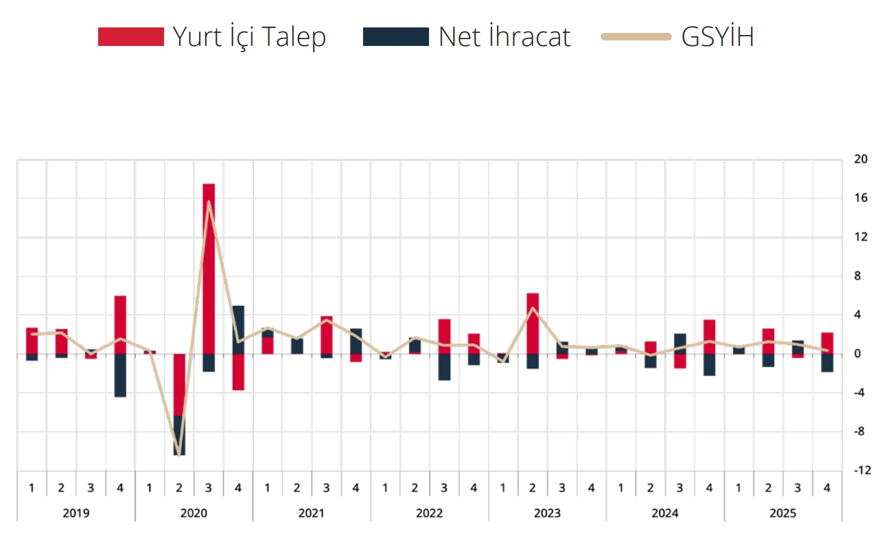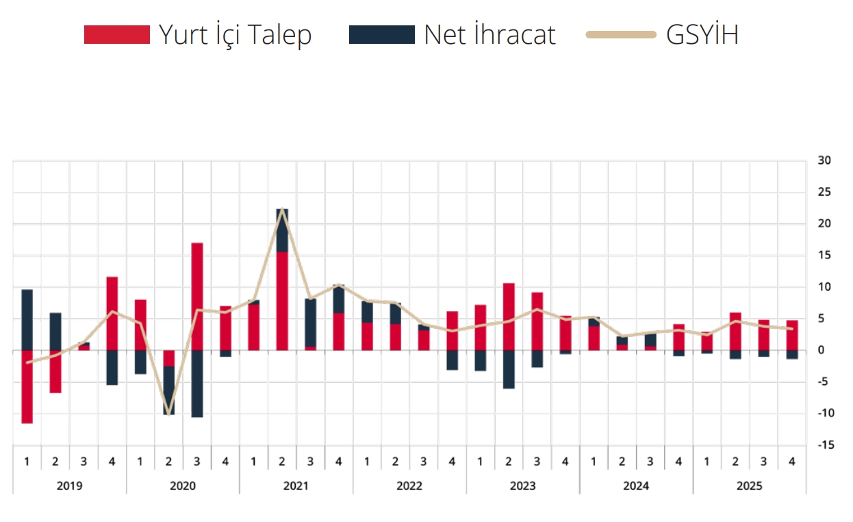 GSYH, yılın dördüncü çeyreğinde yıllık bazda yüzde 3,4, çeyreklik bazda ise yüzde 0,4 oranında büyümüştür. Bu dönemde özel tüketim ve yatırımlar yıllık büyümeye pozitif katkı vermeye devam etmiştir. Çeyreklik olarak ise özel tüketimin pozitif katkısı bir önceki çeyreğe göre artarken yatırımlar makine teçhizat yatırımlarındaki gerilemeyle birlikte çeyreklik büyümeye negatif katkı vermiştir. Bu dönemde mal ve hizmet ihracatı çeyreklik olarak daralırken mal ve hizmet ithalatı artış göstermiştir. Böylelikle net ihracatın çeyreklik büyümeye katkısı negatife dönmüştür. Bu çerçevede, iktisadi faaliyet 2025 yılında yıllık bazda ılımlı seyretmiş ve büyüme oranı yüzde 3,6 olarak gerçekleşmiştir. Harcama yönünden bakıldığında, özel tüketimin yıllık büyümeye katkısı bir önceki yılın sınırlı olarak altında gerçekleşmiştir. Üretim tarafından bakıldığında, yılın genelinde büyümenin temel sürükleyicisi hizmetler sektörü olurken, sanayi ve inşaat sektörü de büyümeye artış yönünde katkı sağlamıştır. Don ve kuraklık olayları nedeniyle bitkisel üretimdeki gerilemenin etkisiyle tarım katma değeri düşüş kaydetmiştir.