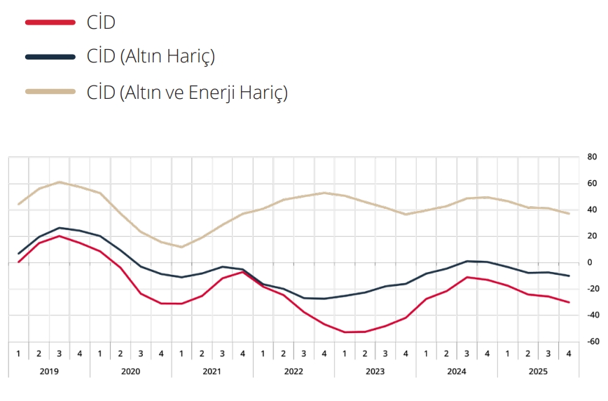 2026 yılının mart ayında ödemeler dengesi verilerinde, birincil gelir dengesi altındaki portföy yatırımları kaleminde faiz giderlerinin hesaplamasında yöntem değişikliğine gidilerek, 2020 yılının Eylül ayından başlamak üzere geriye dönük revizyon yapılmıştır. Menkul kıymet sahibinin yerleşikliğinin esas alındığı söz konusu revizyon, cari işlemler açığını söz konusu dönemde toplamda 8,9 milyar ABD dolar artırıcı yönde etkilemiş, bu etkinin 4,8 milyar doları ise 2025 yılında gerçeklemiştir. Revizyonun karşılıklı etkisi net hata noksan kalemine aynı tutarda yansımıştır. Böylelikle 2025 yıl geneli cari açığı revizyon öncesindeki 25,2 milyar dolardan revizyon sonrasında 30,1 milyar dolara, cari açığın GSYH’ye oranı ise yüzde 1,6’dan yüzde 1,9 seviyesine yükselmiştir.