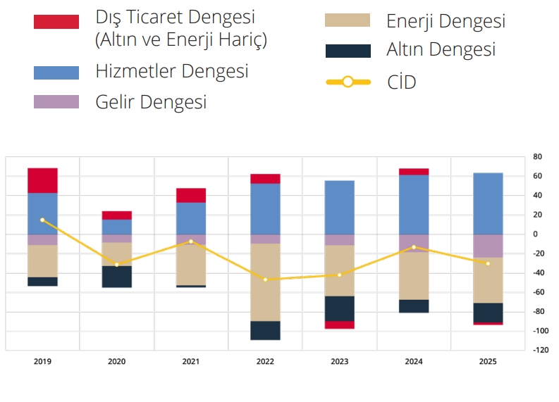 Söz konusu gelişmelerin etkisiyle, 2025 yılında cari işlemler açığı, bir önceki yıla kıyasla artarak 30,1 milyar dolar olmuştur. Böylece, cari işlemler açığının milli gelire oranı yüzde 1,9 seviyesinde gerçekleşmiş ve tarihsel ortalamaların altında ılımlı bir görünüm sergilemiştir.