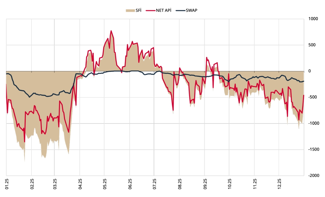 2025 yılında SFİ’deki 192 milyar TL tutarındaki azalış başta zorunlu karşılık tesisleri kaynaklı olmak üzere para tabanındaki değişimden kaynaklanmıştır. Ayrıca, T.C. Hazine ve Maliye Bakanlığı’nın net iç borçlanma tutarındaki değişim sistemdeki fazla likidite seviyesinin gerilemesinde etkili olmuştur.