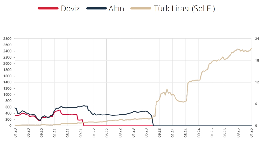 20 Ocak 2025 tarihi itibarıyla KKM hesaplarında 6 ve 12 ay vadeli hesap açma ve yenileme işlemleri sonlandırılmıştır. 15 Şubat 2025 itibarıyla tüzel kişilerin KKM hesabı (YUVAM hesapları dahil) açma ve yenileme işlemleri sonlandırılmış ve tüzel kişi KKM hesapları, KKM’nin TL’ye geçişine ve yenilenmesine ilişkin hedeflerden çıkarılmıştır. 21 Haziran 2025 tarihinde 6 aya kadar vadeli KKM hesaplarına uygulanan ZK oranı yüzde 33’ten yüzde 40’a yükseltilmiş, KKM hesapları için belirlenen asgari faiz oranı düşürülmüştür. Aynı tarihte KKM’den TL’ye geçiş hedefi kaldırılırken KKM’nin yenilenmesi ve TL’ye geçişine ilişkin toplam hedef korunmuştur. 23 Ağustos 2025 tarihinde ise KKM hesap açma ve yenileme işlemleri (YUVAM hesapları hariç) gerçek kişiler için de sonlandırılmıştır. Bu karar ile birlikte KKM’nin TL’ye geçişine ve yenilenmesine ilişkin toplam hedef kaldırılarak ZK faiz/telafi ve komisyon düzenlemeleri gözden geçirilmiştir. Atılan adımlar sonucunda 2023 Ağustos ayı itibarıyla 143 milyar ABD dolarına ulaşmış olan KKM bakiyesi 2025 yılı sonunda sıfıra yakın seviyelere gerilemiştir.