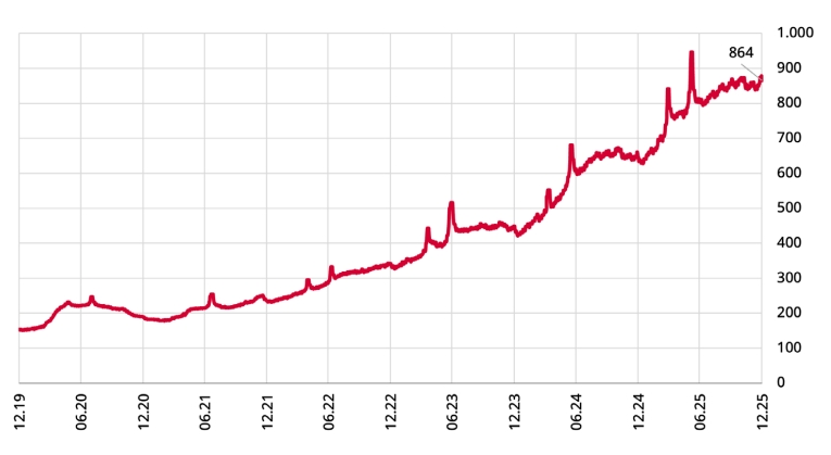 2025 yılına 645 milyar TL seviyesinde başlayan emisyon hacmi, yıl başından itibaren girdiği kademeli artış eğilimi ile Haziran ayında 946 milyar TL tutarla tarihinin en yüksek seviyesine ulaşmış ve yılı 864 milyar TL ile kapatmıştır (Grafik 2.6.1).