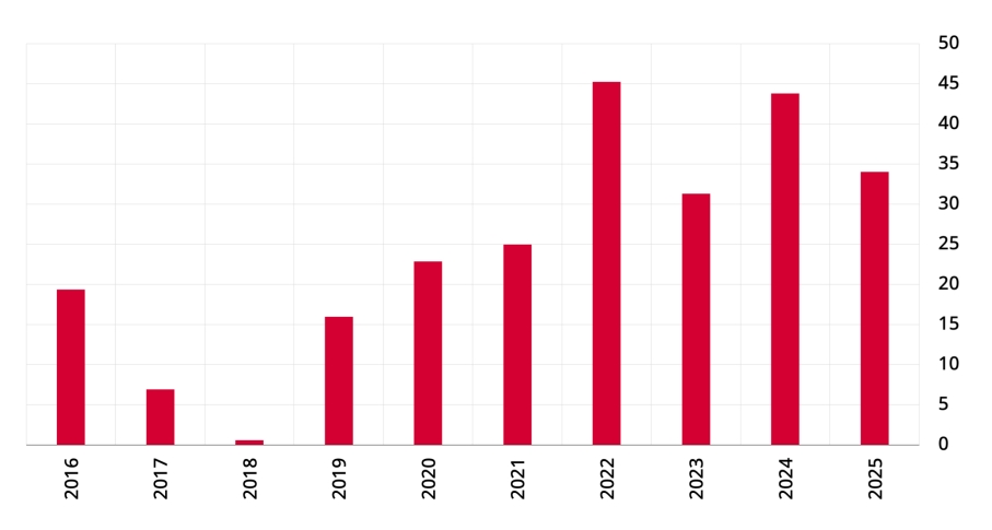 2025 yıl sonu itibarıyla emisyon hacminde yüzde 34, dolaşımdaki banknot sayısında ise yüzde 23 oranında artış gerçekleşmiştir. Son 10 yıllık dönemde yıl sonu itibarıyla emisyon hacmi yıllık ortalama yüzde 24, dolaşımdaki banknot sayısı ise yıllık ortalama yüzde 15 oranında artmıştır (Grafik 2.6.2).