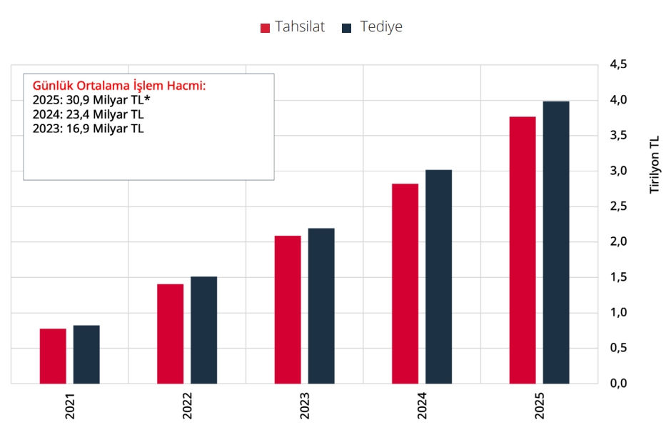 * Günlük ortalama 11,3 milyar TL tahsilat ve 12,1 milyar TL tediye işlem hacmi